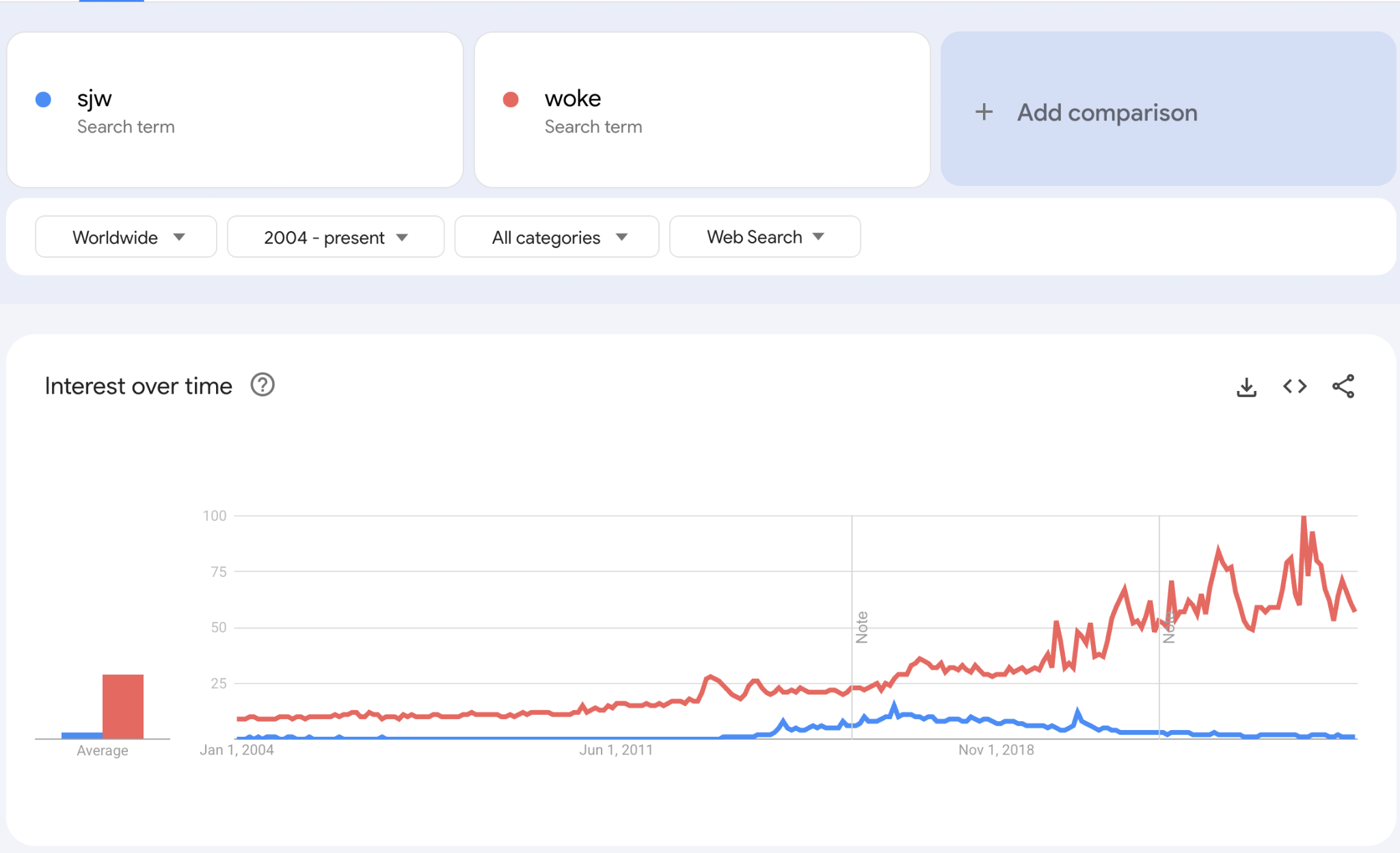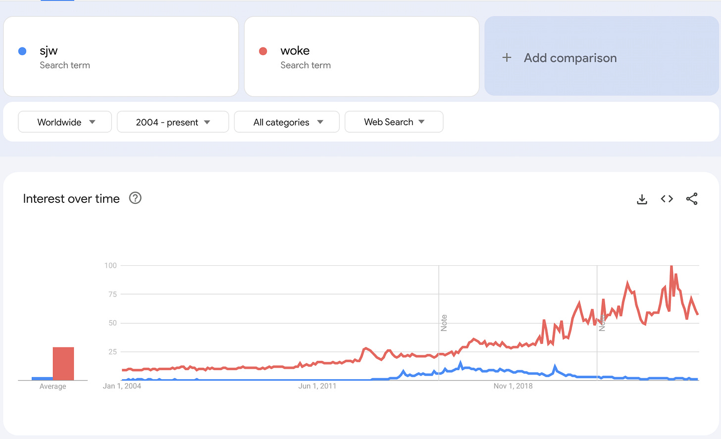 Trends SJW vs WokeNotice how SJW (“Social Justice Warrior”) which preceded it got nearly completely dropped once a better term was found to name what was, at heart, the same phenomenon.