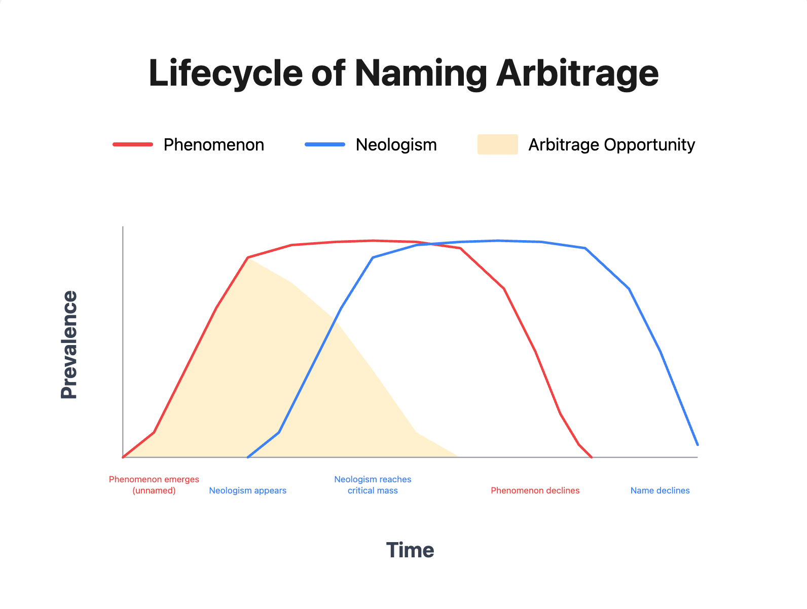 Put simply: A new phenomenon emerges. No one has a name for it. As it grows everyone feels it, but doesn’t really have the language to point to it at all. Trying to talk about it is awkward and stilted. Yet, the phenomenon is growing at increasing speed. This period is the arbitrage window. When the phenomenon has grown big enough more people try to put an effort into naming it. Then, some people start attempting to name it. Most of these fail to take off1. Eventually one sticks, reaching critical mass. Everyone can now do what they couldn’t do before: talk about the phenomenon and start coordinating how they act towards it (usually to do away with it). The arbitrage window starts shrinking and the cycle is over.