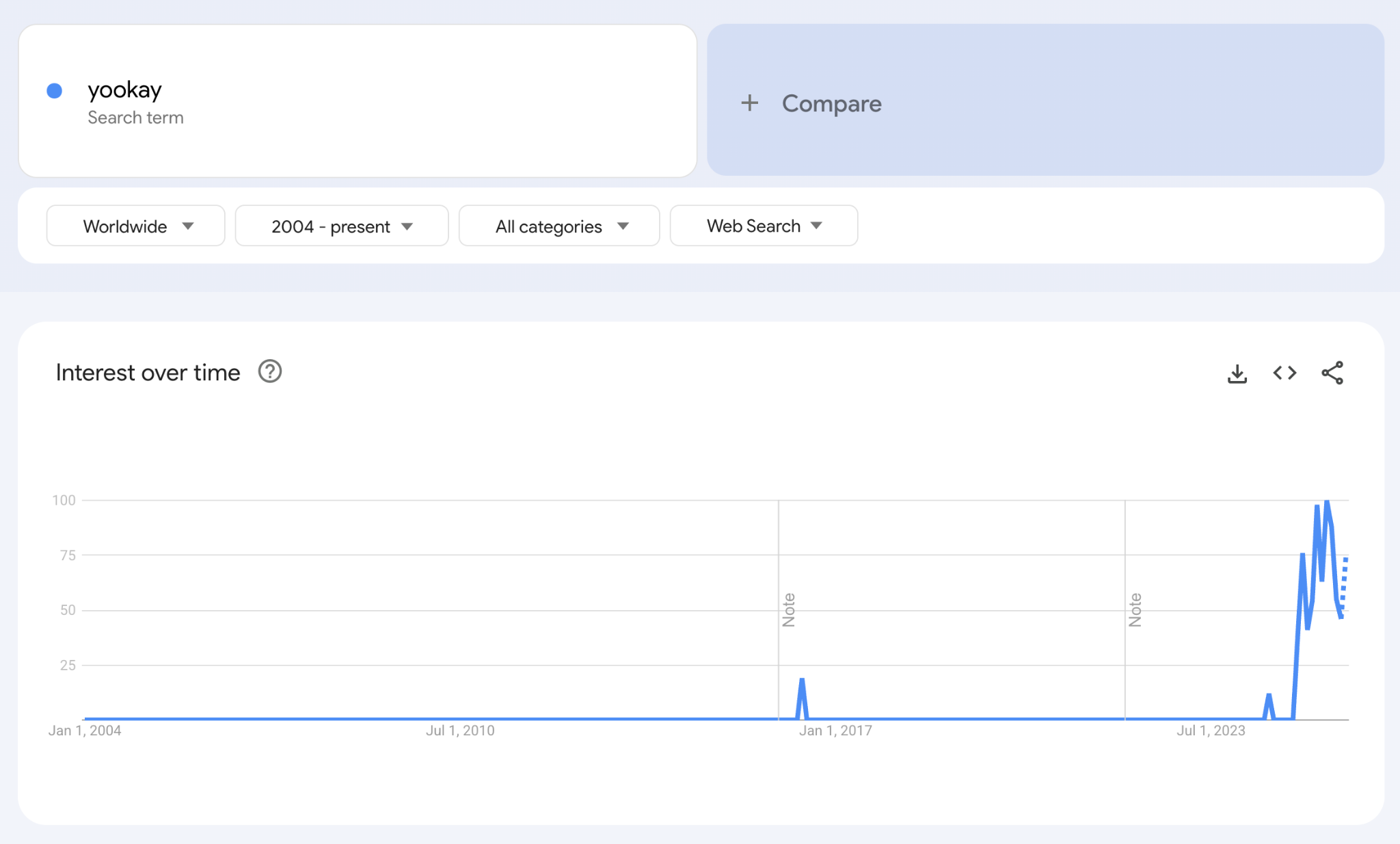 The Yookay Aesthetics is being relatively successful (50k followers with 3k posts). You can also see it succeeding both in the growing interest in “YooKay” as a search term, over time and in being addressed in more legacy publications, like Compact Magazine.