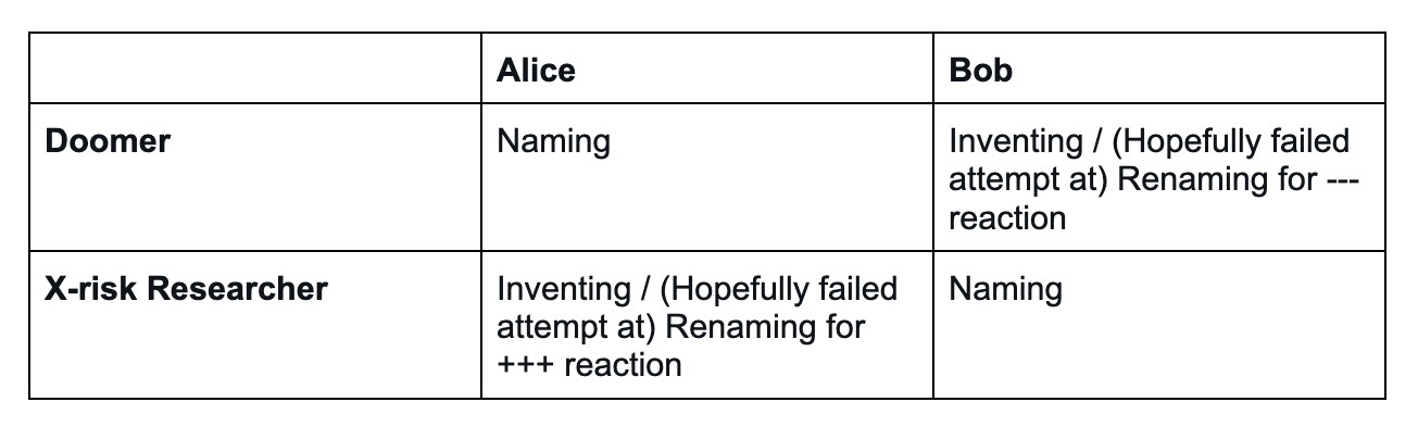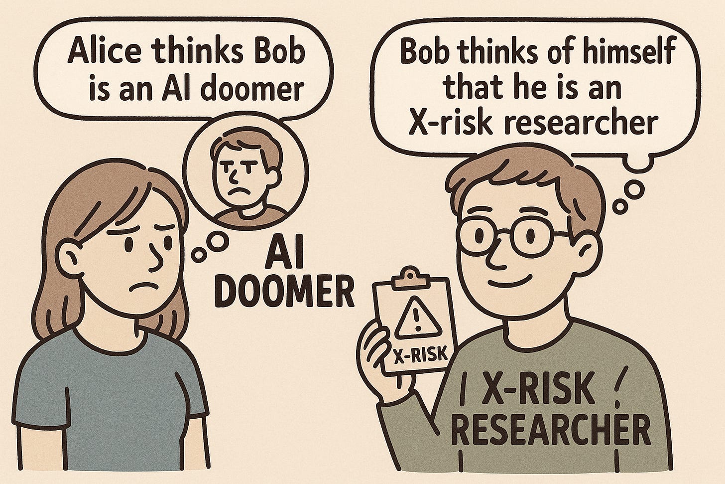 Alice and Bob disagree on how to best describe Bob. Bob calls himself an X-risk researcher. Alice calls Bob an AI doomer.